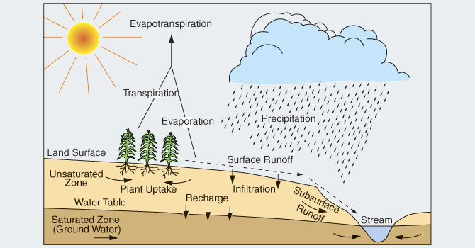 Typically, most water from precipitation that infiltrates does not become recharge. Instead, it is stored in the soil zone and eventually returned to the atmosphere by evaporation and plant transpiration. The percentage of precipitation that becomes diffuse recharge is highly variable, being influenced by factors such as weather patterns, properties of surface soils, vegetation, local topography, depth to the water table, and the time and space scales over which calculations are made. Recharge to the water table can occur in response to individual precipitation events in regions having shallow water tables. In contrast, unsaturated zone water in some desert regions is estimated to have infiltrated the soil surface as long as tens of thousands of years ago.